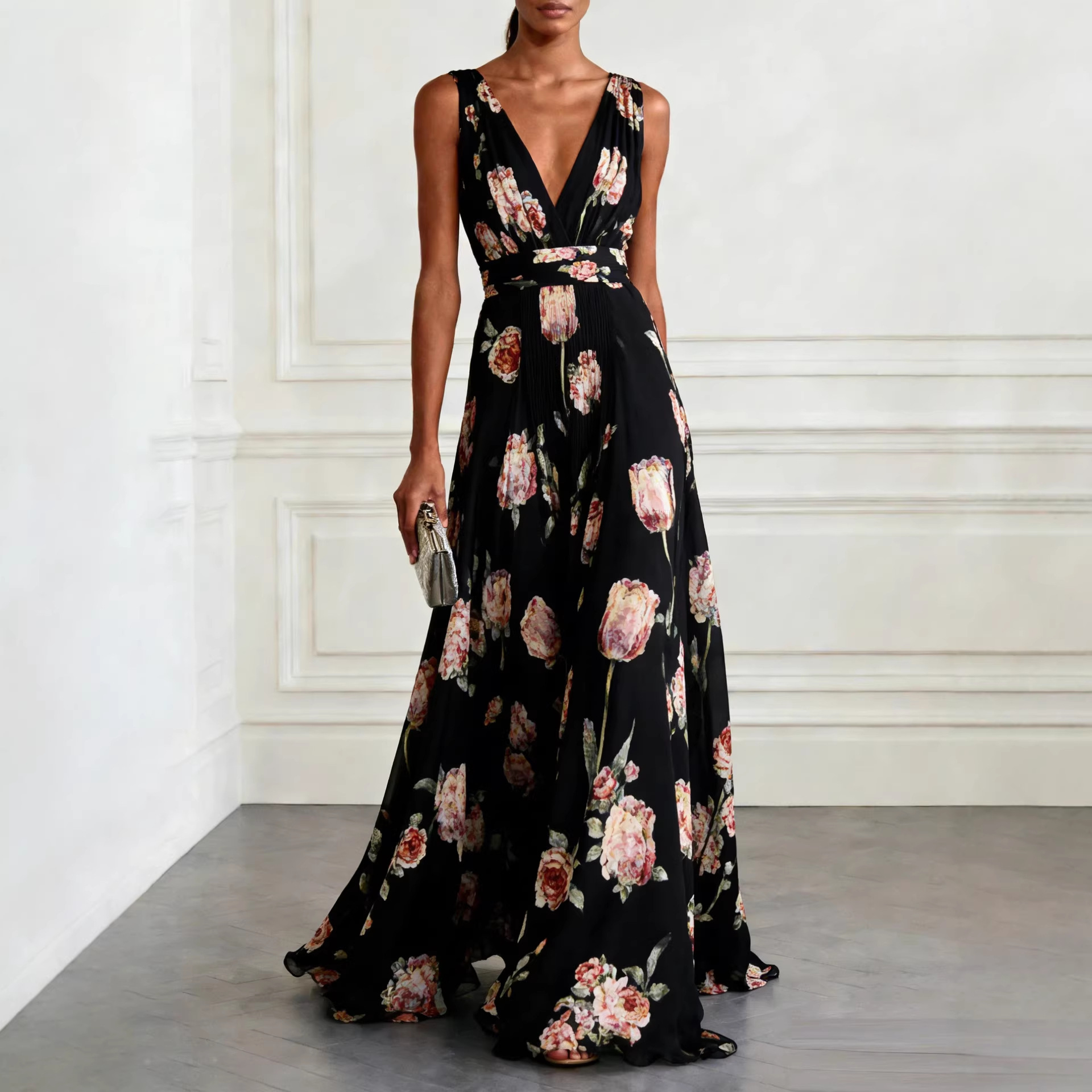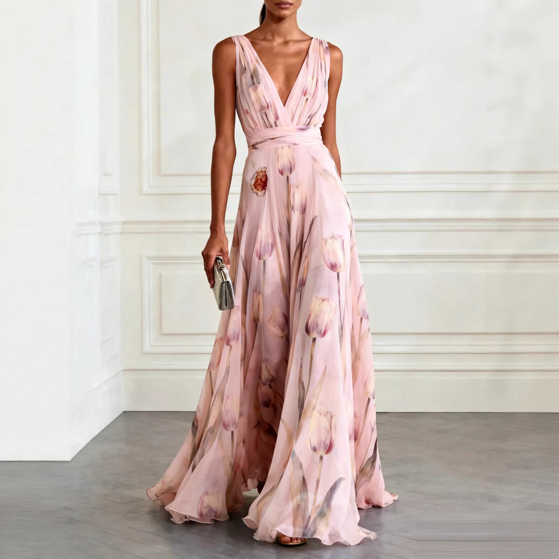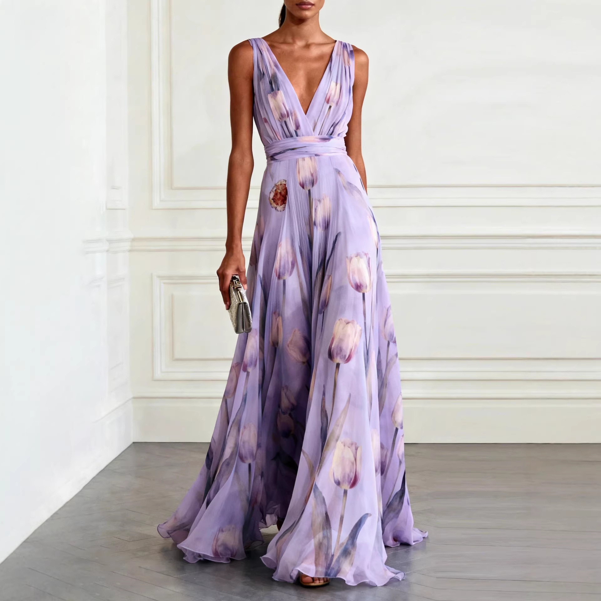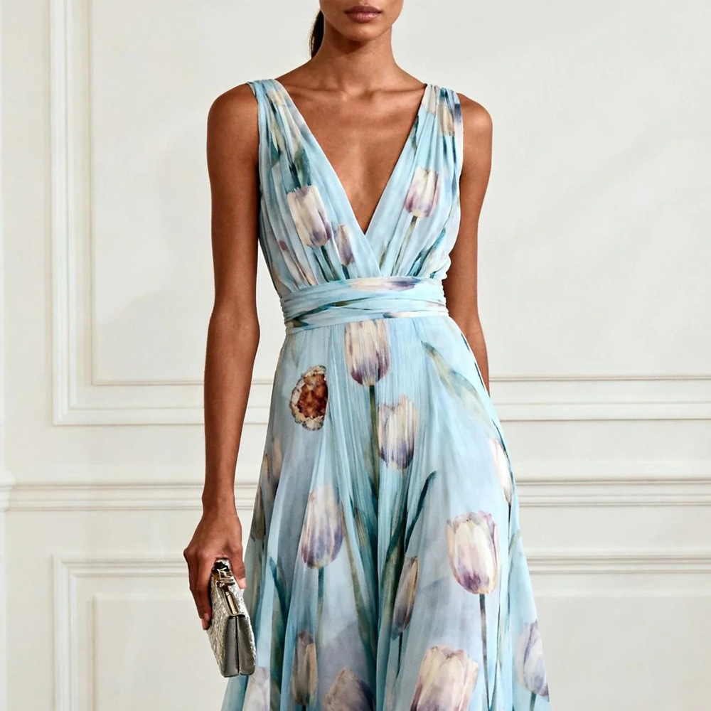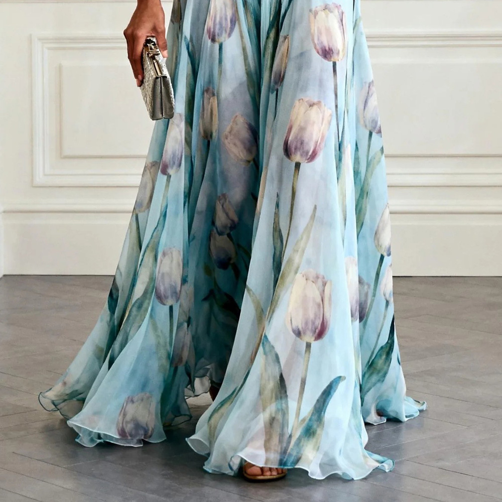 Bluesy Tulip-Print Gown Elegant Flowing Sleeveless V-Neck Chiffon Maxi Dress For Parties And Formal Events